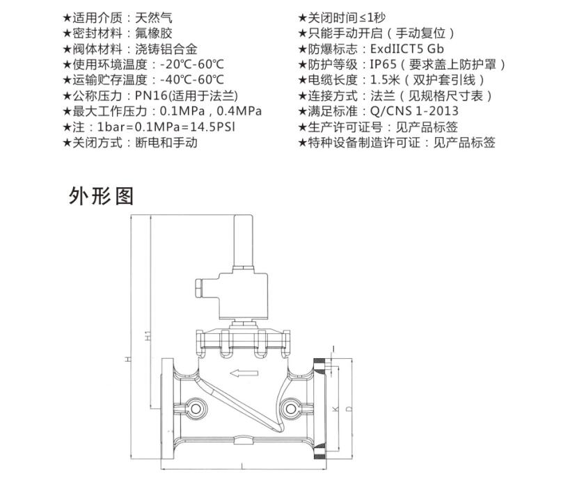 鋁合金電磁式燃氣緊急切斷閥-常閉型技術參數: